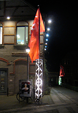 Damit Ihre Veranstaltung schon von weitem sichtbar ist. Der Fahnenmast baut auf einer Traverse mit 40cm Kantenlänge auf, diese kann in Ihren Firmenfarben beleuchtet werden. Die Konstruktion ist eigenstabil so das keine externen Baumassnahmen notwendig sind.